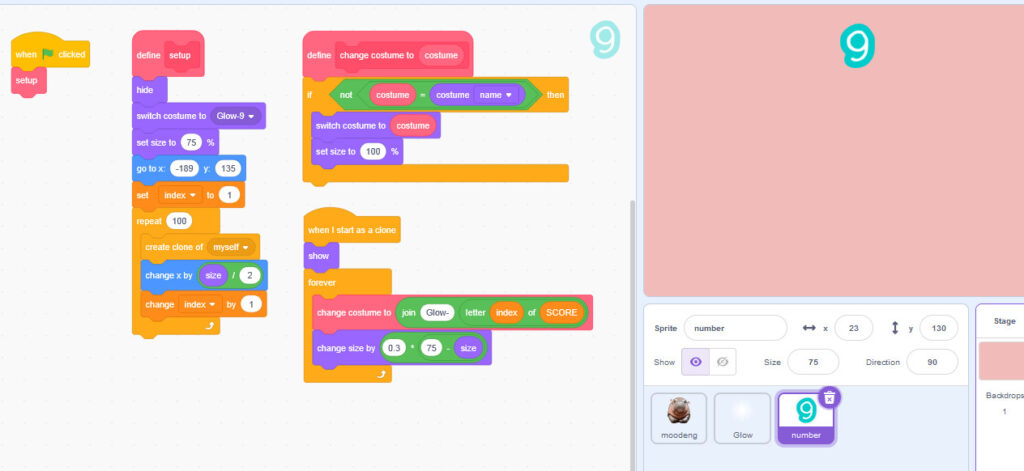 2.โค้ด ตัวเลขของคะแนน เราจะเปลี่ยนเลขคะแนนในตัวแปรของ Scracth ที่เล็ก ไม่น่าสนใจ ให้เป็น Sprite กราฟฟิกตัวเลขแทน