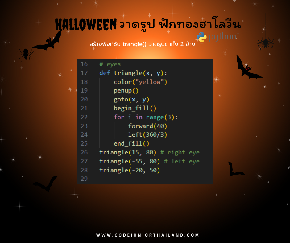 ในฟังก์ชั่น triangle() จะวาดรูปตา เป็นรูป 3 เหลี่ยม และกำหนดตำแหน่งของตาซ้ายและตาขวา